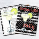 Schwarz-Weiß gestreift mit silber, funkelnd Polka-Punkten und chaotisch schwarz Aquarell im Hintergrund. Eine Aquarellmargarita mit Limonem Bild. Korallenfarbtext, vorne "Junggeselinnen-Abschied". Umgekehrt: Anpassbarer Text für Ihren nächsten Junggeselinnen-Abschied mit gleichem, großen Margarita Glas.