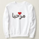 Mutiger Text "Marhaba" im Arabisch = im Willkommen, hallo - schwarzer Schriftart wird auf einem Sweatshirt mit einem roten Herzen gedruckt.