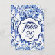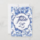 Carte numéro de table mariage avec un design de toile fleurie bleue et blanche.