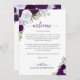 Ces belles cartes sont conçues pour accueillir vos invités et les membres spéciaux de votre cortège de mariage. Le design rustique boho chic comprend des roses aquarelles peintes à la main, des feuilles d'eucalyptus et de la verdure de jardin dans des tons de pourpre, prune et lavande. Le devant comporte un espace pour un message de bienvenue, et au dos se trouve le programme ou l'itinéraire. Excellent ajout à un sac d'accueil de mariage, et une merveilleuse façon de remercier vos invités de célébrer avec vous !