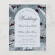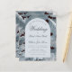 Un faire-part de mariage budgétaire qui combine des éléments vintages et modernes. Sur un arrière - plan d'acanthus gris bleuté feuilles sur noir (un motif vintage William Morris, maintenant dans le domaine public), il y a une arche blanche avec du texte dedans. Le mot Mariage et les noms sont écrits dans un élégant script calligraphique, la première ligne est du texte arché.