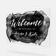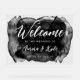 Panneau de bienvenue mariage acrylique avec des polices blanches contre une tache d'aquarelle noire pour un look translucide. Bienvenue et vos noms dans un script charmant. Mariage acrylique couleur noire signe d'accueil personnalisé avec vos noms et date mariage et emplacement du mariage. Tout le texte est personnalisable selon vos besoins.