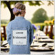 Une veste en denim bleu pour une demoiselle d'honneur, avec un panneau mignon sur le dos. Le panneau est modelé avec des pois bleu pâle, et peut être personnalisé pour le jour de mariage. Le nom de la demoiselle d'honneur est en haut en lettres capitales élégantes. Le mot 'Bridesmaid' est au centre du panneau, et plus bas sont les initiales du couple heureux et leur date et lieu mariages. Un ajout élégant et attrayant à cette occasion spéciale.