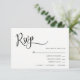 Cartes RSVP mariage élégantes et uniques. Arrière - plan blanc (peut être changé en n'importe quelle couleur) et script noir calligraphie RSVP. Initiales de mariée et mariée au dos de la carte. Placez pour ajouter le MENU au choix. Modèles modifiables pour ajouter votre propre texte. Parfait pour tous les thèmes mariages ou l'époque de l'année. Ajoutez ces fiches de réponse à vos invitations. Voir collection.