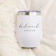 Le tumbler à vin de mariage personnalisé pour votre fête de mariée comporte "femme de ménage" dans une élégante typographie de calligraphie classique avec le nom de votre femme de ménage sous le nom.