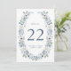Numéro de tableau du Mariage Floral Bleu. Entrez dans un jardin de beauté botanique et découvrez un superbe design de carte de numéro de table mariage avec de belles fleurs d'aquarelle peintes à la main disposées dans une jolie couronne vintage. Les délicates roses bleu, crème et blanc et la végétation sauge verte d'eucalyptus créent une élégance rustique, parfaite pour votre événement spécial ! La police bleu-gris et les subtiles touches bleues complètent parfaitement le design intemporel. Laissez cette invitation exquise express votre élégance romantique rustique et le style intemporel.