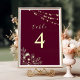Elégante carte de numéro de table de mariage avec un arrière - plan bordeaux profond, lumières à cordes romantiques et dentelle dorée fleurie. Parfait pour les réceptions d'automne ou de soir, ce panneau de table ajoute une touche élégante et coordonnée à votre disposition.