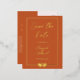 Mariage Sauvegarder la date carte postale feuille ajoute une touche élégante à votre enregistrement des dates. L'avant de la carte postale du mariage présente un véritable papier d'aluminium. Customisez le texte à l'avant et à l'arrière du mariage enregistrer la date. Idéal pour les couples utilisant la terre cuite comme leur couleur mariage. Couleurs en terre cuite et or. Utilisez le modèle pour créer votre propre feuille de mariage enregistrer la date carte postale en terre cuite.