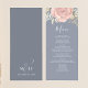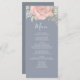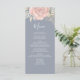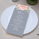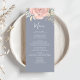 Ce design comprend une carte de menu mariage simple et moderne, élégante, avec un script de calligraphie élégant, une simple rose rose vif, fleurie et verte, et un arrière - plan bleu, le décor parfait de la réception