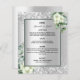 Personnalisez et ajoutez vos noms, votre date et le menu mariage. Arrière - plan de couleur argent faux, décoré de fleurs blanches et de verdure, confetti.
