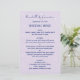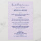 Modèle de menu Lavender violet mariage. Les contours de fleurs d'Hibiscus font un motif léger sur l'arrière - plan. Le texte est bleu marine foncé avec les noms du couple en haut avec la date et le titre du menu. Ajoutez tous les éléments de menu d'un paragraphe au fur et à mesure que vous choisissez. Le libellé de l'exemple a commencé par des lettres majuscules et des espaces entre les sections. Le dos du papier est un violet plus foncé avec le même motif floral.