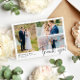 Dites merci à vos invités de mariage avec un collage de photos où vous pouvez mettre en vedette trois de vos propres belles photos de mariage. Ajoutez vos noms et la date de mariage dans une police noire moderne. Merci est écrit dans un script manuscrit charmant. Au dos, vous pouvez écrire à la main un message de remerciement personnel sur le fond faiblement ligné.