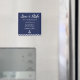 Mariage nautique Enregistrer la Date magnets avec rayures bleu marine et blanc, ancre blanche et texte blanc changeant imprimé sur arrière - plan bleu marine