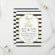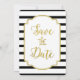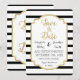 Carte de annonce de mariage save the date avec un motif classique de rayures noires et blanches et des détails dorés vintage. Personnalisable avec vos informations de mariage, disponible dans une large gamme de produits de mariage assortis. Contactez-nous pour demander une modification de couleur ou un produit personnalisé.