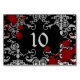 Carte de table de réception de mariage gothique Halloween avec un motif damassé gris sur le noir sur les deux côtés et des éclaboussures de sang. Ajoutez facilement le bon numéro de siège de table. Les éclats de sang sont amovibles.