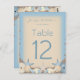 Un beau numéro de table de mariage de destination avec un thème exotique de plage. Un joli arrière - plan de texture de sable dans les tons crème et bleu marine est parsemé de nombreux petits galets de plage. Au-dessus des galets se trouvent des coquillages, des oursins, des étoiles de mer et des perles.
