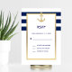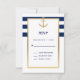 Elégante carte de mariage nautique RSVP personnalisée. Bandes bleues et blanches de marine avec cadre et ancre en faux or. Parfait pour toute destination/nautique/mariage d'été. Cartes modifiables - facile d'ajouter vos informations ou de modifier la police, la couleur et la taille du texte.