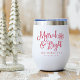 Festive et chic vin de vacances tumbler pour les jeunes mariés présente "marié et lumineux" en écriture rouge accentué avec un flocon de neige. Personnalisez avec vos noms et date ou année mariage.