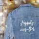 Faites une déclaration avec cette veste en jean de mariage personnalisée ! Avec la phrase "Heureux pour toujours" dans une police de caractères élégante, ce modèle peut être personnalisé avec les noms des mariés, la date du mariage, le lieu ou tout autre texte de votre choix. Un cadeau attentionné et élégant que votre mariée aimera ! Couleurs imprimées : blanc sur jean bleu.