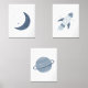 Ajoutez une touche finale à l'espace de votre petit avec cette fusée aquarelle, cette lune et cet ensemble d'empreintes de planète.