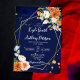 Roses orange et blanc sauge eucalyptus vert marine bleu arrière - plan or géométrique cadre modèle floral faire-part de mariage avec QR RSVP code à l'arrière.
