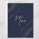 Une touche d'étoile dorée sur un arrière - plan de la Marine ajoute un aspect élégant à ce menu de réception de mariage. Texte avant : Menu de type or. Le texte inverse comprend : Menu, Sélections apéritives, Entre Sélections et Sélections de desserts sur un arrière - plan blanc. Pour personnaliser, insérez simplement vos détails dans notre modèle facile, en remplaçant l'exemple de texte. Assurez-vous de voir l'ensemble de la collection de Mariages Marine et Gold Stardust pour les pièces correspondantes.