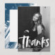 Carte de remerciements moderne de graduation avec la photo du diplômé avec "grad" dans une superposition de script de brosse blanche. Personnalisez le devant de la carte de remerciements de graduation en ajoutant le nom, l'école, le nom et l'année de graduation du diplômé. L'arrière de la carte offre de l'espace pour votre message dactylographié ou manuscrit avec un arrière - plan de touches marines peintes.