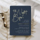 Die Gäste werden eingeladen, das glückliche Paar mit diesen modernen und minimalen Duscheinladungen zu feiern. Einfaches Design in lässiger, handgeschriebener Goldfolie-Schrift, unten rechts ausgerichtet, auf einem marineblauen Hintergrund.
