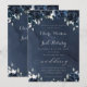 Une suite marine de faire-part de mariage avec un arrière - plan bleu marine à l'aquarelle en cascade avec des fleurs de marine et de pivoines blanches et de la végétation d'eucalyptus argenté. Une élégante calligraphie de police swash met en évidence la suite d'invitations et de papeterie accessoire.