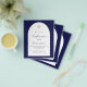 Bitte beachten Sie, dass diese Einladung auf Flyer Papier und sehr dünn ist. Umschläge sind nicht enthalten. Für dickere Einladungen (gleiche Gestaltung) besuchen Sie bitte unseren Shop. Ein marinierter Hintergrund und ein weißer Bogen. Personalisieren und einen Namen und Zeremonie Details. Elegantes handgeschriebenes Stilskript. Zurück: marineblau Hintergrund.