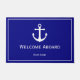 Willkommen Besucher auf Ihrem Boot. Der weiße Bootanker liegt über dem Text. Sie können den Bootsnamen und Ihre Nachricht unter dem Anker hinzufügen. Der gesamte Text ist weiß und kann bearbeitet oder gelöscht werden. Die Matte ist Marineblau.