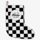 Schachte Quadrate Schwarz-Weiß Retro Monogram Weihnachtszeit Strumpf. Schachbrettplatze geometrisches Retromuster Urlaub Geschenk. Cooles geometrisches rechteckiges Muster in Retro. Vintage Fliesen Schwarz-weiß modernes Schachbrett. Personalisieren Sie Ihre individuelle Eingabe und Ihren eigenen Namen.