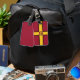 Gepäckmarke mit Design mit einer Fahne des historischen Landkreises von Northamptonshire in England, Großbritannien; Maronflagge mit Goldkreuz und die traditionelle Rose des Landkreises in der Mitte