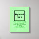 Imprimez sur toile que vous pouvez customiser pour mettre votre nom d'entreprise et d'autres informations de votre entreprise. Vous pouvez l'utiliser comme matériel de marketing pour annoncer votre entreprise ou pour promouvoir votre marque auprès de clients ou de clients. Impression de toile personnalisable que vous pouvez utiliser pour sensibiliser la marque. Customisez-le et affichez-le sur le mur de votre magasin, magasin, bureau, hall, réception, entrée ou dans un endroit approprié visible par les clients ou les clients. Les couleurs et la forme de conception sont des textes vert foncé sur vert clair arrière - plan et format de portrait rectangle forme. Pour customiser cette impression de toile, téléchargez votre logo d'entreprise, tapez votre nom d'entreprise, votre adresse, votre numéro de téléphone, votre adresse électronique et votre site Web ou votre page de médias sociaux. Après avoir téléchargé le logo et tapé des textes, veuillez vérifier l'apparence. Si l'apparence vous plaît, vous pouvez passer votre commande maintenant. Si vous avez besoin de redimensionner et déplacer le logo et les textes pour s'adapter à cette impression de toile, s'il vous plaît changer dans l'outil de conception. Vous pouvez également effectuer d'autres modifications dans l'outil de conception en fonction de l'apparence de cette impression de toile que vous préférez, comme changer la couleur arrière - plan, la couleur de police et le style de police.