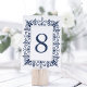 Die modernen marokkanischen inspirierten Tischnummern-Karten haben eine geometrische Grenze in Marineblau und Weiß, die Ihre Tischnummer umgibt. Design wiederholt sich auf der Rückseite. Koordiniert mit unserer Hochzeitssuite in Marrakesch in Navy.