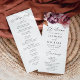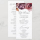 Rustikales Hochzeitsprogramm im Herbst mit einer obersten Kante von Wasserfarben Herbst Blume und Blätter in den Farben Marsala, Bordeaux, lila, braun und Orange. Der Herbst-Blumenstrauß wird durch eine moderne Kalligraphie ergänzt. Personalisieren Sie die Front des Herbstbohblühenden Hochzeitsprogramms mit Ihren Namen, Hochzeitsdatum und Ort, und Reihenfolge der Zeremonie. Das Programm kehrt zurück, um eine Liste Ihrer Hochzeitsfeier anzuzeigen. Entworfen, um sich mit unserer rustikalen Herbstblumenhochzeit-Sammlung zu koordinieren.