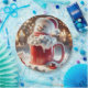 Ein fröhlicher Marshmallow-Schneemann sitzt in einer roten Tasse, die mit heißem Kakao gefüllt ist und mit Mini-Marshmallows und Weihnachtsschmuck umsäumt ist