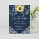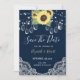 Rustikale Mason Glas, Spitze, Sonnenblumen und Saitenleuchten auf marineblau blauem Hintergrund. Schönes Save the Date, dass mit Ihrem Namen angepasst werden kann. Wählen Sie die Schaltfläche "Anpassen", um Stil, Farbe und Größe des Schriftartes zu ändern.