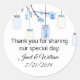 Hübscher Rundaufkleber mit weißer Gastgeschenk Hochzeit, mit weißen und blauen Mauerkirschen, der an einem blühenden, blühenden Baumstamm hängt. Personalisieren Sie den Text für Ihre Hochzeit. Matching Produkte sind erhältlich.