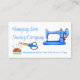 Die Visitenkarte ist nach Maß in Weiß gefertigt, mit einer hellblauen, altmodischen Nähmaschine, in der Mitte und einem Button Kissen und Scheren, unten links. Personalisieren Sie alle Textfelder für Ihre geschäftlichen Anforderungen. Wählen Sie den Kartenbestand, den Sie mit diesem Design bevorzugen.