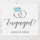 Diese individuellen Schaumweinetiketten sagen Verlobt, zusammen mit einem silberfarbenen Verlobung-Ring aus blauem Diamant und den Namen von Braut und Zwerg. Ideal für eine Verlobungsfeier!
