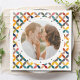 Custom Foto Modernes, Personalisiertes Party Napkins besticht durch ein farbenfrohes, modernes geometrisches Muster mit Ihrem bevorzugten Foto in der Mitte. FOTO TIPP: Zentrieren Sie Ihr Foto vor dem Hochladen nach Zazzle. Von Evco Studio entworfen www.zazzle.com/store/evcostudio