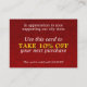 Custom Luxury Business Discount Card Erhöhen Sie die Verlobung Ihrer Kunden und treiben Sie den Umsatz mit dieser luxuriösen Discount-Karte, mit der Sie einen bleibenden Eindruck verlassen haben. Der reiche rote Hintergrund strahlt Eleganz und Dringlichkeit aus, was Ihr besonderes Angebot hervorhebt. Mit einem schlanken und beruflichen Design können Sie Ihr Firmenlogo hochladen und bei jeder Transaktion eine starke Markenerkennung gewährleisten. Diese Discount-Karte eignet sich ideal für Einzelhändler, Restaurants, Salons und Dienstleistungsunternehmen und bietet eine klare, kontrastreiche Textanlage in Gold und Weiß, die den Kunden das Verständnis und die Bedienung erleichtert. Auf haltbaren, hochwertigen Cardstock gedruckt, ist es perfekt für Treueprogramme, Werbeaktionen und Kampagnen zur Kundenzufriedenheit. Merkmale: - Auffallender Luxus-Hintergrund für einen kühnen und auffälligen Look - Anpassbar mit Ihrem Logo für eine verbesserte Markendarstellung - Eleganter Gold- und Weißtext für eine berufliche Touch - Hochwertiger Cardstock für Langlebigkeit und Premium-Gefühl - Ideal für Treueprogramme, Werbeaktionen und Werbegeschenke Machen Sie Ihre Werbeaktionen stilvoll mit dieser dynamischen Red Discount-Karte, die die Kundenbindung und das Wachstum ankurbeleben!
