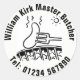 Butcher Shop Aufkleber mit Ihrer Wahl von Firmenname und Telefonnummer. Die Illustration zeigt eine Wurst auf einer Gabel.