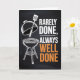A bold and rustic card for the man who loves to grill. Featuring a silhouette of a steak and grilling tools over a chalkboard-style background with orange and red "flame" accents. The text reads "REARELY DONE, ALWAYS WELL DONE".