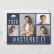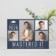 Moderne Meister Abschluss dunkelblauen Abschluss-Ankündigungskarte mit einer 4 Foto-Collage, "Mastered It" geschrieben in großen weißen Buchstaben und die Graduierung Jahr, Name und Schule oder Universität in einfachen Weiß Typografie. Fügen Sie auf der Rückseite ein zusätzliches Foto und eine personalisierte Meldung hinzu.