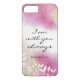 Das iPhone-Gehäuse mit inspirierender Zitat-Schrift zeigt ein schönes Blatt-Design mit einem grünen und rosa Splash-Hintergrund. Es zeigt einen Teil der Bibelverse Matthew 28:20, in den Worten von Jesus: "Ich bin immer bei dir."