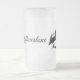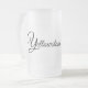 Diese große mattierte Tasse aus Glas wird mit einem Kunstdruck eines Wolfs mit Yellowstone-Text gezeigt. Passen Sie dieses Objekt an oder kaufen Sie, wie es ist. Bild