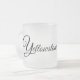 Diese mattierte Tasse aus Glas wird mit einem Kunstdruck eines Wolfs mit Yellowstone-Text gezeigt. Passen Sie dieses Objekt an oder kaufen Sie, wie es ist.