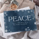 Beeindrucken Sie jeden auf Ihrer Weihnachtskarte mit einer eleganten Schneeflockkarte. Die festliche Non-Foto-Urlaubskarte bietet "Peace" in einem modernen Serif-Schriftart mit Ihrem Namen oder Sondertext. Das Design zeichnet sich durch eine Grenze von weißen Schneeflocken mit einem marinen Aquarell-Hintergrund aus. Auf der Rückseite der Snowflake-Urlaubskarte finden Sie Ihre individuelle Nachricht in weißem Text vor einem marinen Aquarellhintergrund. Das Design koordiniert mit unserer Mattierten Peace Christmas Card Kollektion.